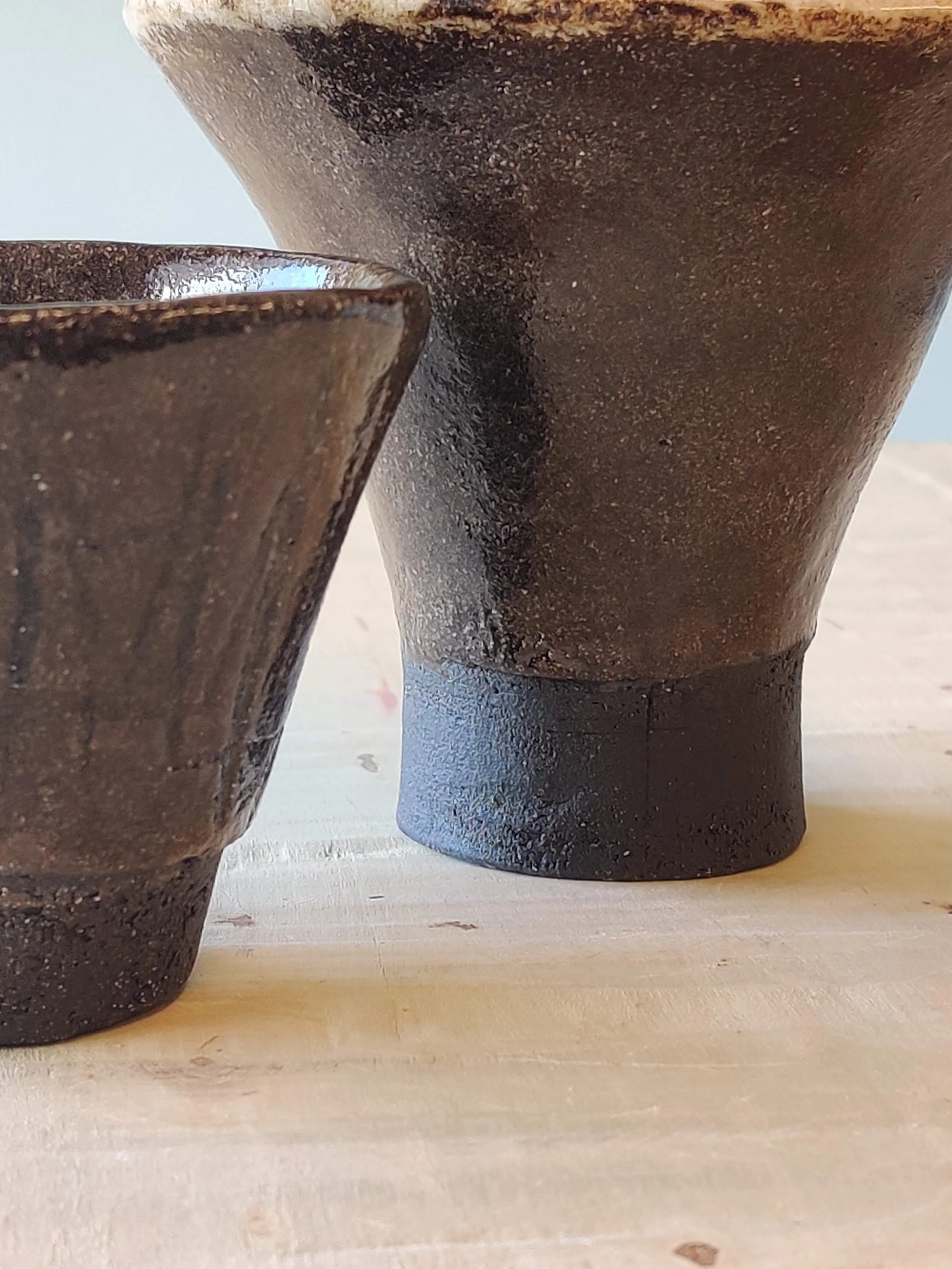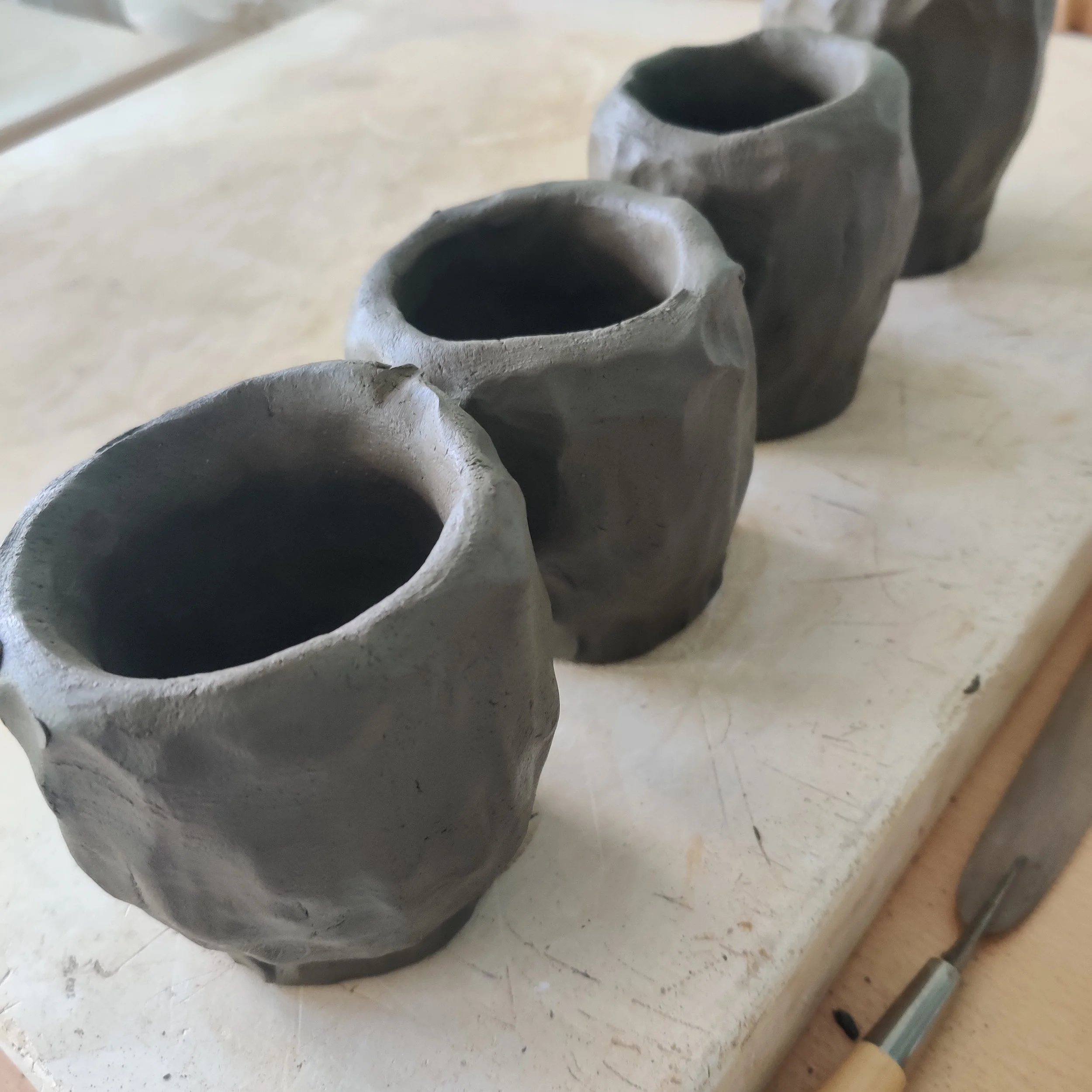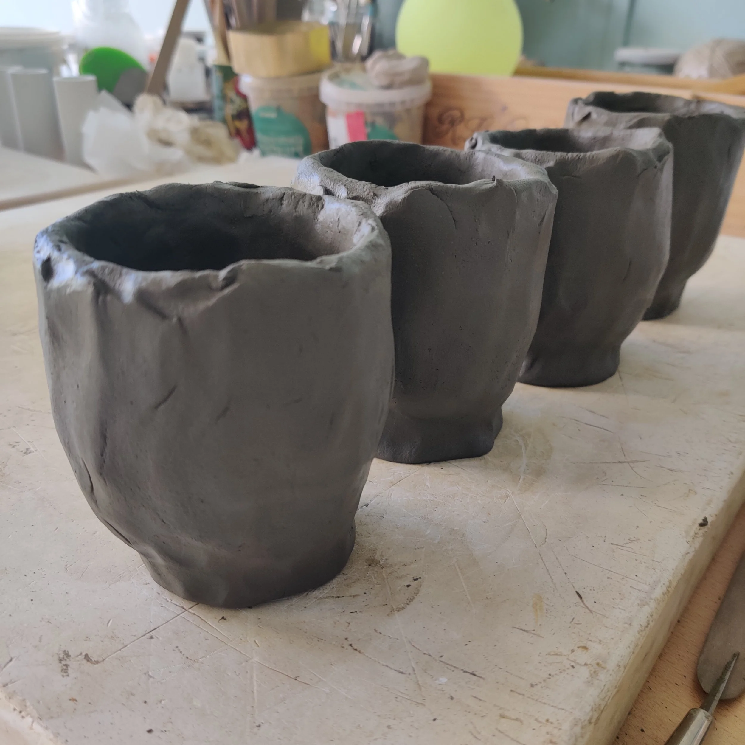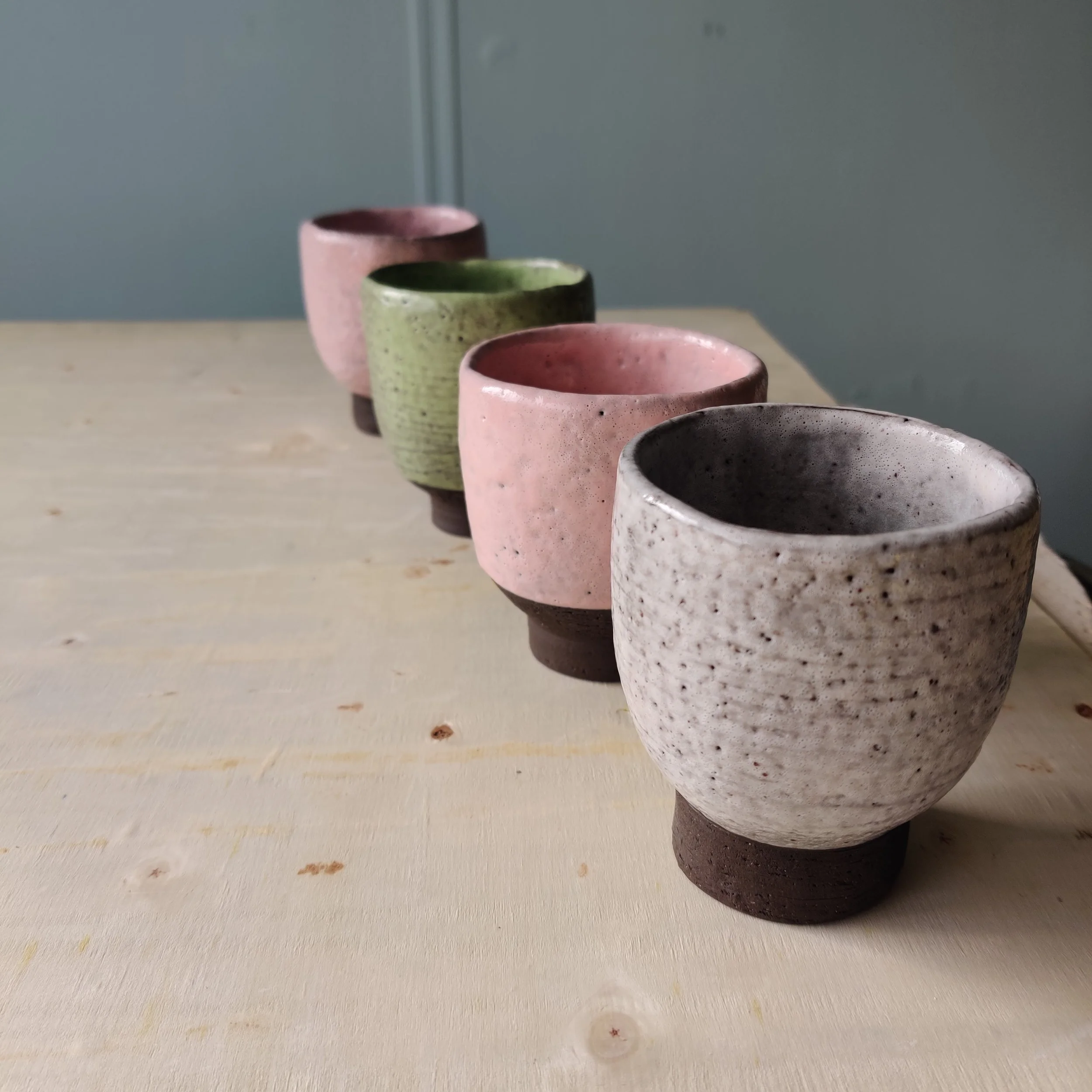Four cups pinched from dark grogged clay over three days. Each one pulled open by hand, refined slowly. Then glazed— pink, sage, speckled white over a dark base.