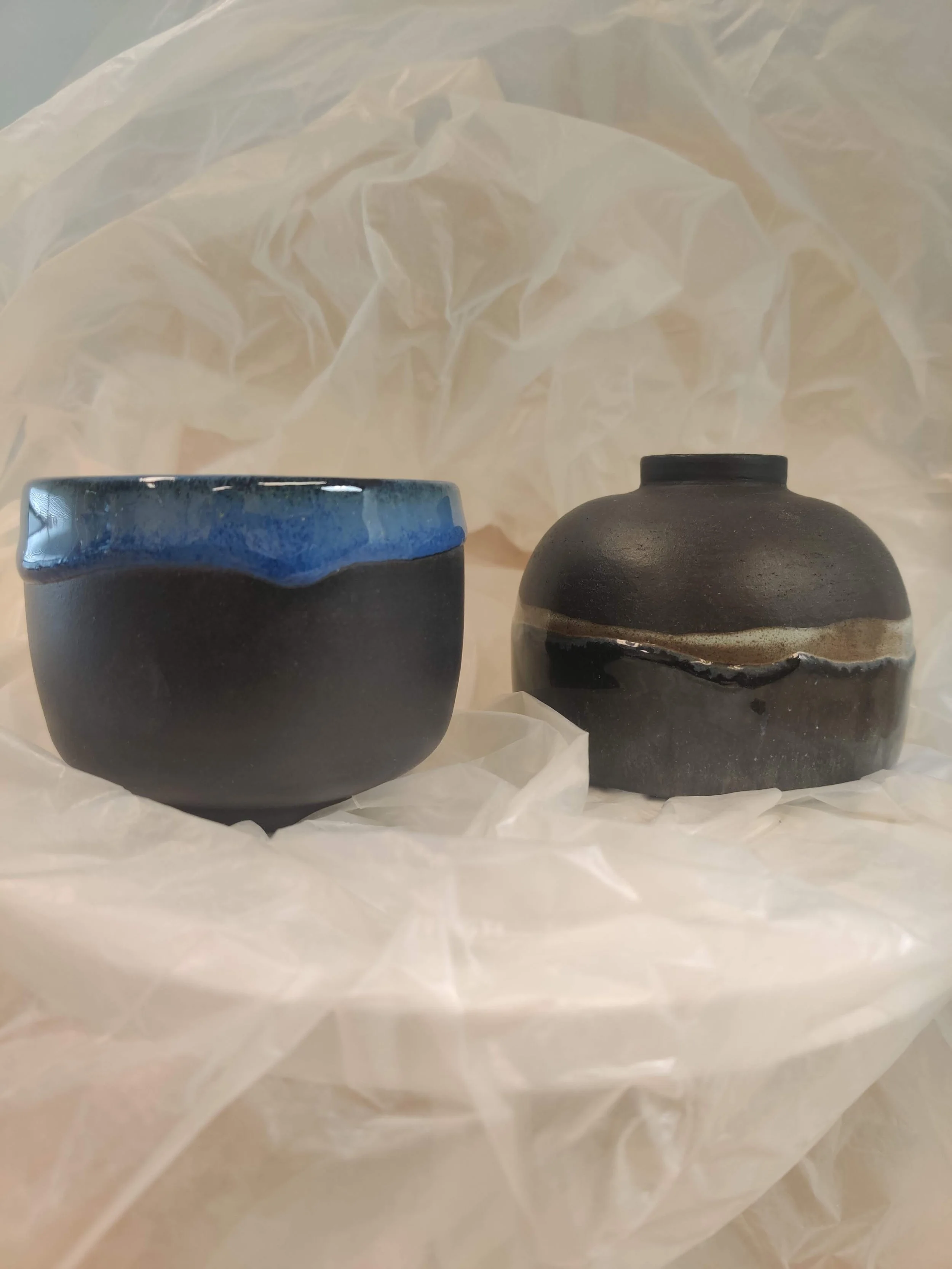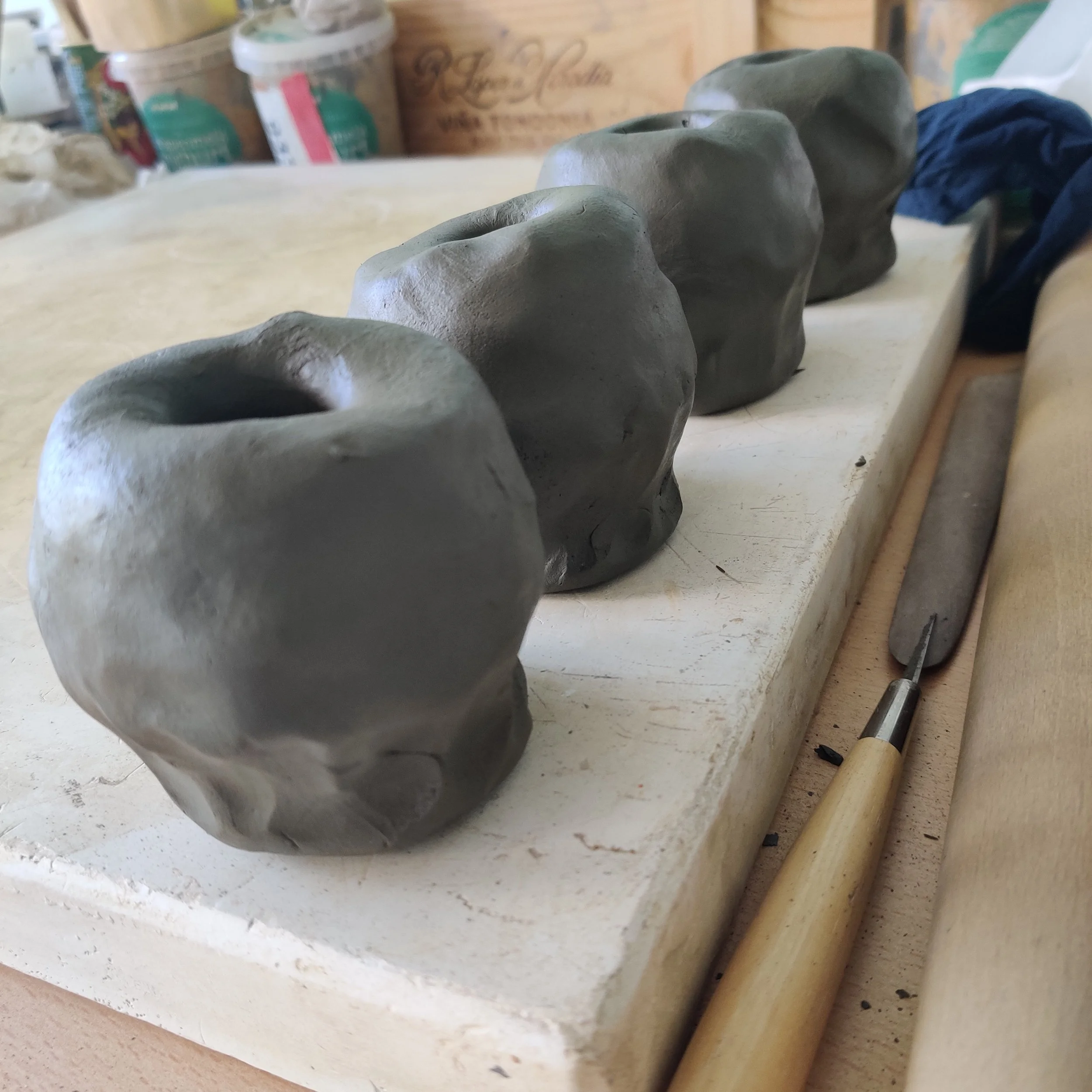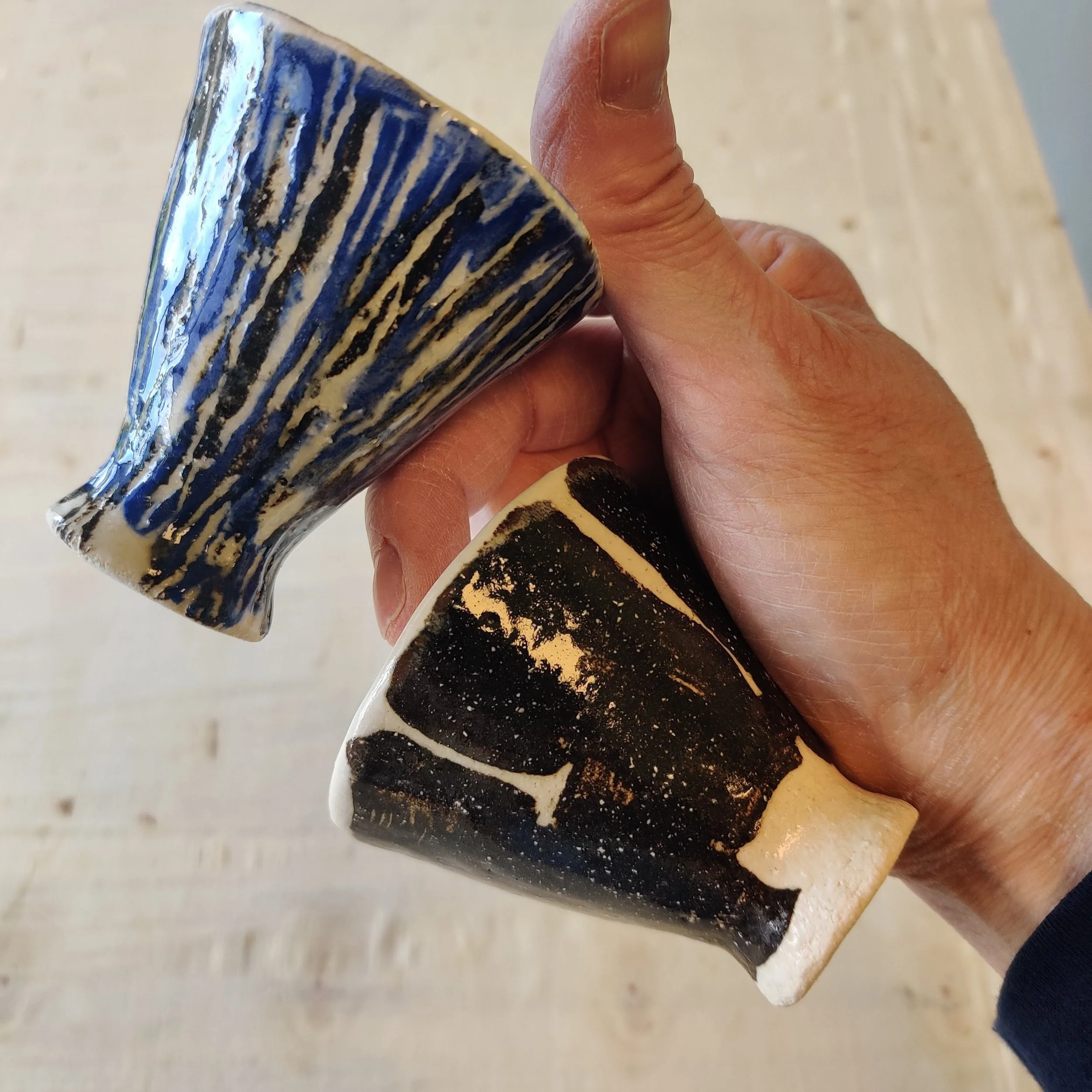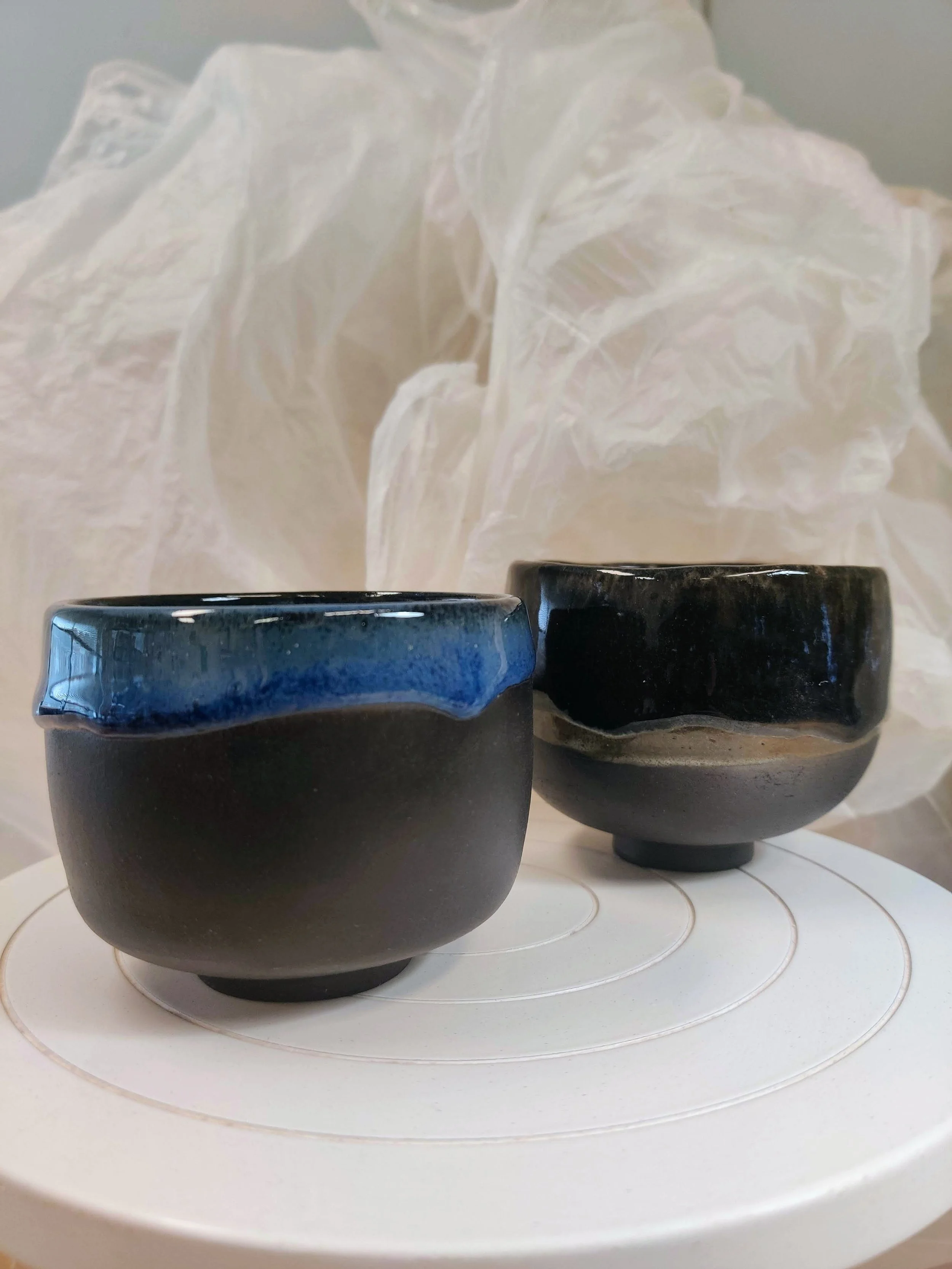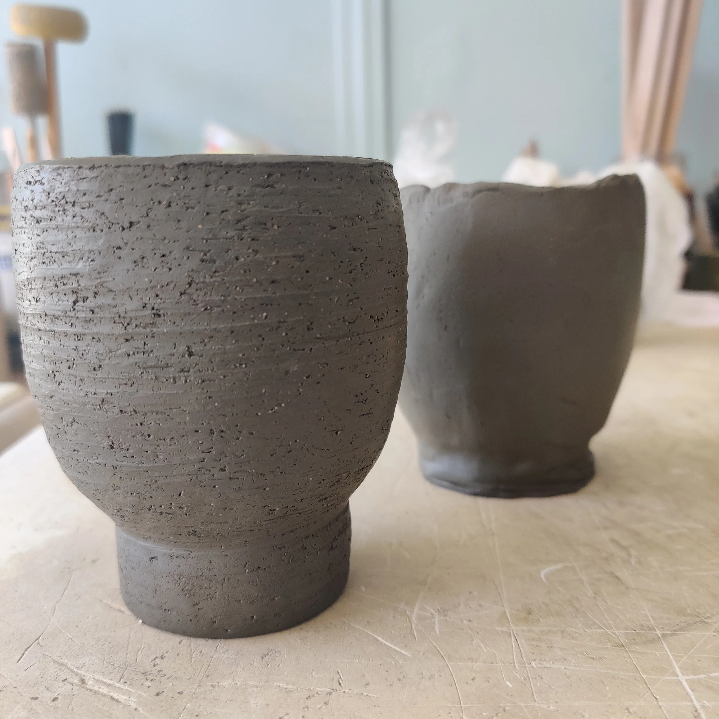Four cups pinched from dark grogged clay over three days. Each one pulled open by hand, refined slowly. Then glazed— pink, sage, speckled white over a dark base.