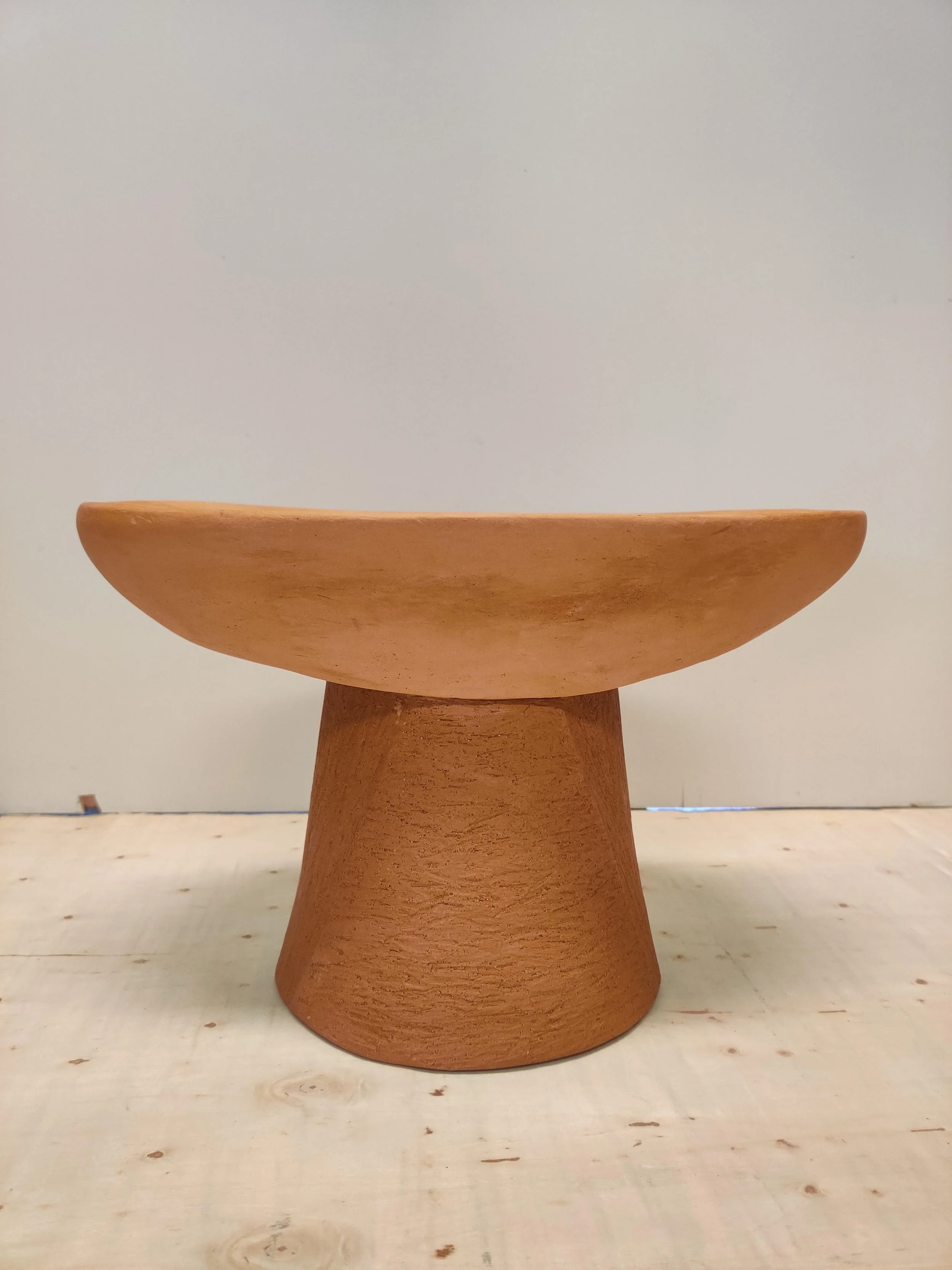 I work with grogged clays — dark, white or red. I start with coils or slabs and sometimes move to the wheel to continue shaping. The clay decides.